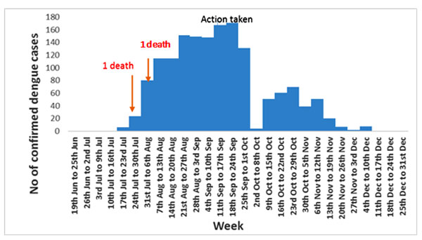 During second week of August 2016, ICMR - National Institute of Cholera & Enteric Diseases, Kolkata was requested by North 24 Parganas District Health authority to carry out an epidemiological investigation at Baranagar Municipality in response to reporting of increased number of fever cases. As a response, ICMR-NICED carried out a thorough epidemiological investigation obtaining three approaches: 1) record review from local health authority 2) Door to door case search in ward no. 1 3) Case search at in/out patient department of Baranagar State General Hospital and confirmed existence of dengue fever outbreak at Baranagar Municipal area which is adjacent to Kolkata by comparing the monthly attack rate of dengue during that period to the previous three years. The outbreak started in the last week of July 2016 and continued till second week of December ,2016 (Fig 2). Total 1660 confirmed dengue cases (Over all attack rate = 7 per 1000) and two deaths (case fatality = 1 per 1000) were reported in this outbreak. ICMR - NICED, tested 212 blood specimens from probable dengue case patients of that area for confirmation through NS1 ELISA/MAC ELISA test and 163 blood specimens turned out to be dengue cases. Out of these 163 dengue cases, serotyping was done for 63 cases and DEN 1 (65%,41/63) was the major circulating serotype.