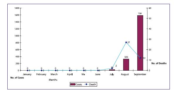 Month-wise Cases and Deaths due to severe diarrhoea in Rayagada district, Orissa, 2010 (up to 21st Sept)