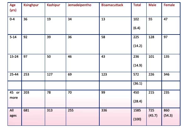 Analysis of 41 deaths in district Rayagada revealed that 10 deaths occurred in 6 villages of three sub-centres in Kashipur Block (including 4 deaths in village Bahardulki), 8 deaths occurred in 6 villages of two sub-centres in Ksinghpur block (including 2 deaths each in village Lekapai and Ksinghpur), and 11 deaths occurred in 6 villages of three sub-centres of Bisamacuttack block (including 4 deaths in village Gadaba, 2 deaths in village Goilkana). Thus multiple deaths occurred in some very small villages. Virtually all deaths occurred in homes (Table 1).