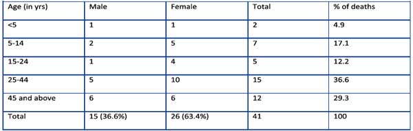 Analysis of age distribution of the deaths in Rayagada revealed that only 4.9% deaths occurred in under-five children and 78% deaths occurred in persons 15 years and above. Deaths in adults following dehydration usually indicate cholera. Male contributed to about 37% of deaths, the remaining 63% deaths occurred in females.