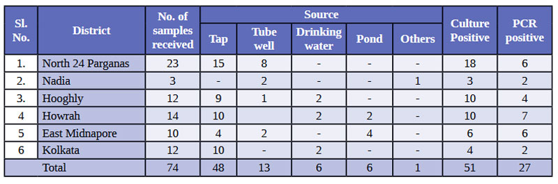 Water samples were received from different PHCs of N. 24 Parganas, Nadia and Hooghly, Howrah, Kolkata and its adjoining areas. Results have been reported to the respective agencies with a copy of the same to State Health Secretariat, Govt. of West Bengal. During the period under report, 74 samples had been received from various sources of which 51 had been found to be positive for faecal coliforms and 27 for presence of V. cholerae (Table 1).