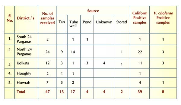 Water samples had been received from different PHCs of N. 24 Parganas, S. 24 Parganas, Hooghly and Kolkata as well as from endemic and epidemic affected Municipal wards under the Kolkata Municipal Corporation and its adjoining areas. During the period under report, 47 samples had been received from various sources of which 39 had been found to be positive for fecal col iforms and 8 for presence of V. cholerae (Table 1).