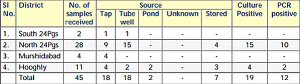 During the epidemic outbreaks (2012-13) of diarrhea spreading across different southern districts of West Bengal, microbial analysis and examination of samples of potable water sources, from different parts of West Bengal and reporting of results to the Govt. agencies, has been a routine activity of the environmental laboratory. Water samples had been received from different PHCs of N. 24 Pargana, S. 24 Pargana, Murshidabad and Hooghly as well as from endemic and epidemic affected Municipal wards under the Kolkata Municipal Corporation and its adjoining areas. Results have been conveyed to the respective agencies with a copy of the same to State Health secretariat, Govt. of West Bengal. During the period under report, 45 samples had been received from various sources of which 20 had been found to be positive for faecal coliforms and 12 for presence of V. cholerae O1 (Table 1).