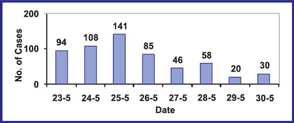 The week from 22nd May was marriage season during which time, there was large movements of groups of people from one village to another to attend the marriages. Most of the cases reported having attended one or other marriage ceremony. On returning to their homes, they fell ill and then spread the diseases to other members of the family. The temperatures had soared upto 48°C and there was acute scarcity of water. Since large amounts of water are required during the marriage ceremonies, water was bought in tankers from 2 open wells in Jhalod town. The wells are privately owned wells. The wells were visited by the team and were observed to be in dire state. The inside linings of the wells were not continuous with gaps in the walls where trees and other fungi and algae had grown. The water was obviously contaminated and the municipal authorities had instructed the owners to chlorinate the wells. In spite of these instructions, there was no residual chlorine in the well waters when the team tested the water with chloroscope. Instructions had also been given to chlorinate the water in the tankers but these also showed negative results for residual chlorine. Considering that the causative organism had been identified to be Vibrio cholerae, (transmitted through water), the cases mostly presented with acute watery diarrhoea with severe dehydration and the contaminated water source, it is highly suggestive of a water borne outbreak (rather than food poisoning as suspected initially). The team visited the several affected villages and interviewed some family members of diarrhoea cases. As expected, most cases reported having attended a marriage ceremony. Interestingly, there were two ladies who had attended different marriages and had only taken water but no food. They also had diarrhoea a nd stool was positive for Vibrio cholerae. This probably clinched the issue of water borne outbreak.