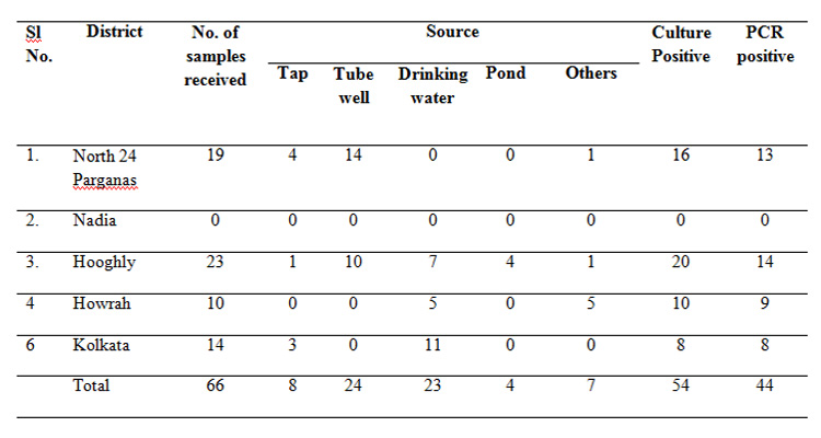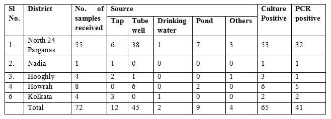 Water samples were received from different PHCs of N. 24 Parganas, Nadia and Hooghly, Howrah, Kolkata and its adjoining areas. Results have been reported to the respective agencies with a copy of the same to State Health Secretariat, Govt. of West Bengal. During the period under report, 74 samples had been received from various sources of which 51 had been found to be positive for faecal coliforms and 27 for presence of V. cholerae (Table 1).